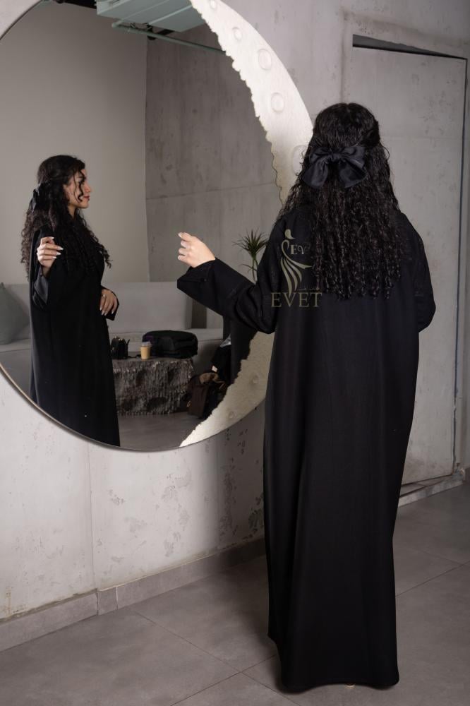 - العباية مصنوعة من قماش الأناقة الكوري الذي يعمل علي ترطيب الجسم وبالتالي لا يسبب الحساسية.